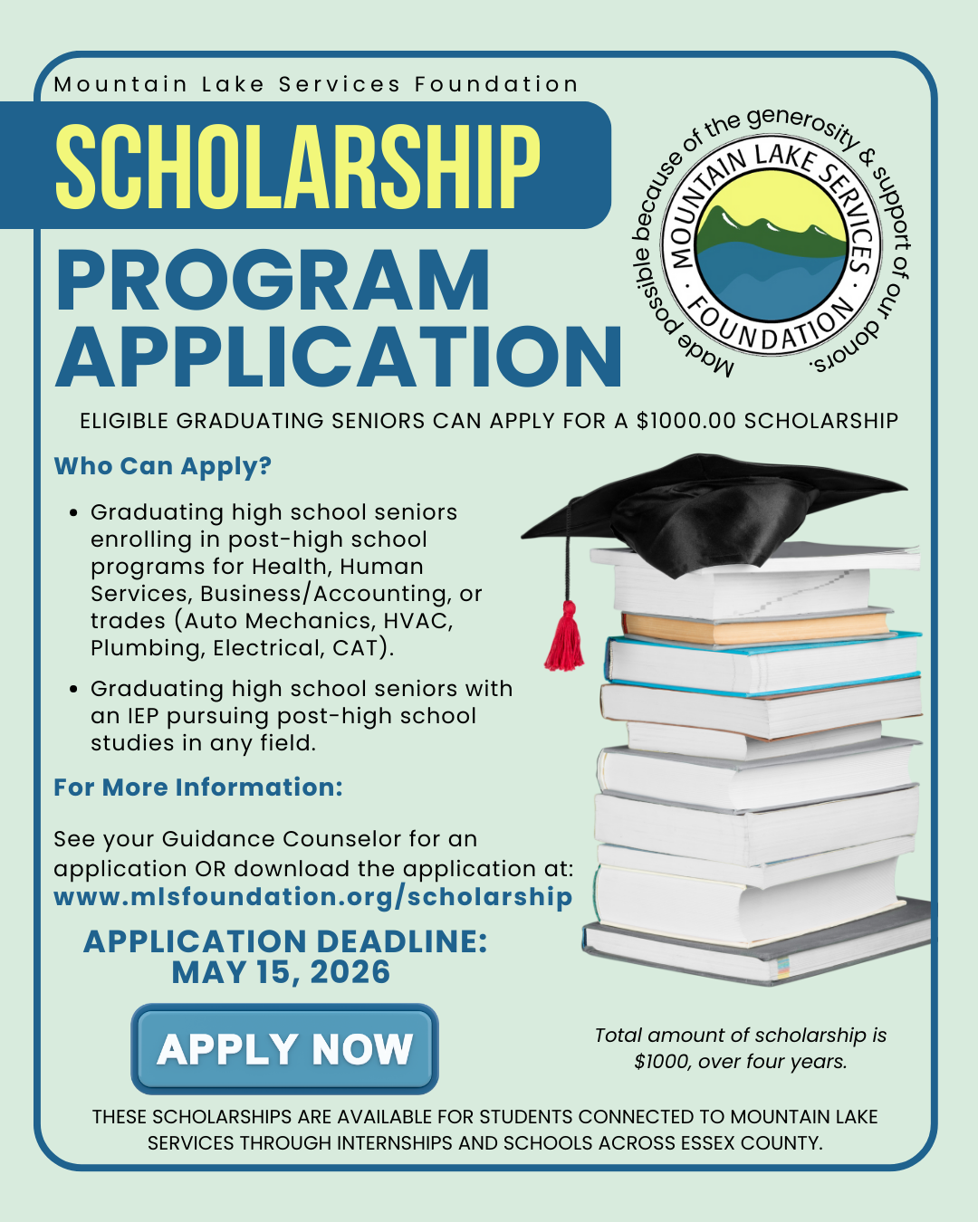 These scholarships are available for students connected to Mountain Lake Services through internships and schools across Essex County, including: